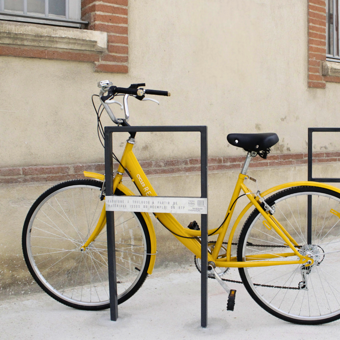 Racks à vélos en A issus de l’économie circulaire du bâtiment en plein parc Michelet rénové (quartier Bonnefoy), ça fait bien plaisir !